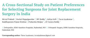 Introduction This study aims to investigate the complex decision-making process of patients in India when choosing surgeons for joint replacement surgery, with a focus on both clinical and non-clinical factors influencing their preferences. Methods This was a cross-sectional observational study conducted at the KIMS-Sunshine Hospitals, Hyderabad, a high-volume tertiary care institute in India, in which patients with end-stage osteoarthritis requiring primary total knee arthroplasty were evaluated using a self-administered questionnaire, which assessed both patient-related and surgeon-related factors in choosing their joint replacement surgeon.