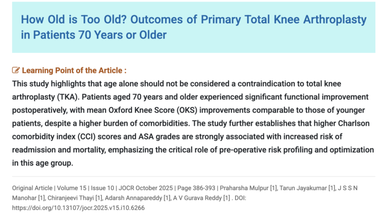 Introduction Despite the increasing demand for total knee arthroplasty (TKA) in elderly patients, outcomes in this demographic remain uncertain due to their higher comorbidity burden and perioperative risks. This study aimed to assess and compare patient-reported outcomes (PROMs), readmission rates, and complications after primary TKA in elderly patients (aged 70 years or older at the time of surgery) versus a matched cohort of younger patients aged <70 years.